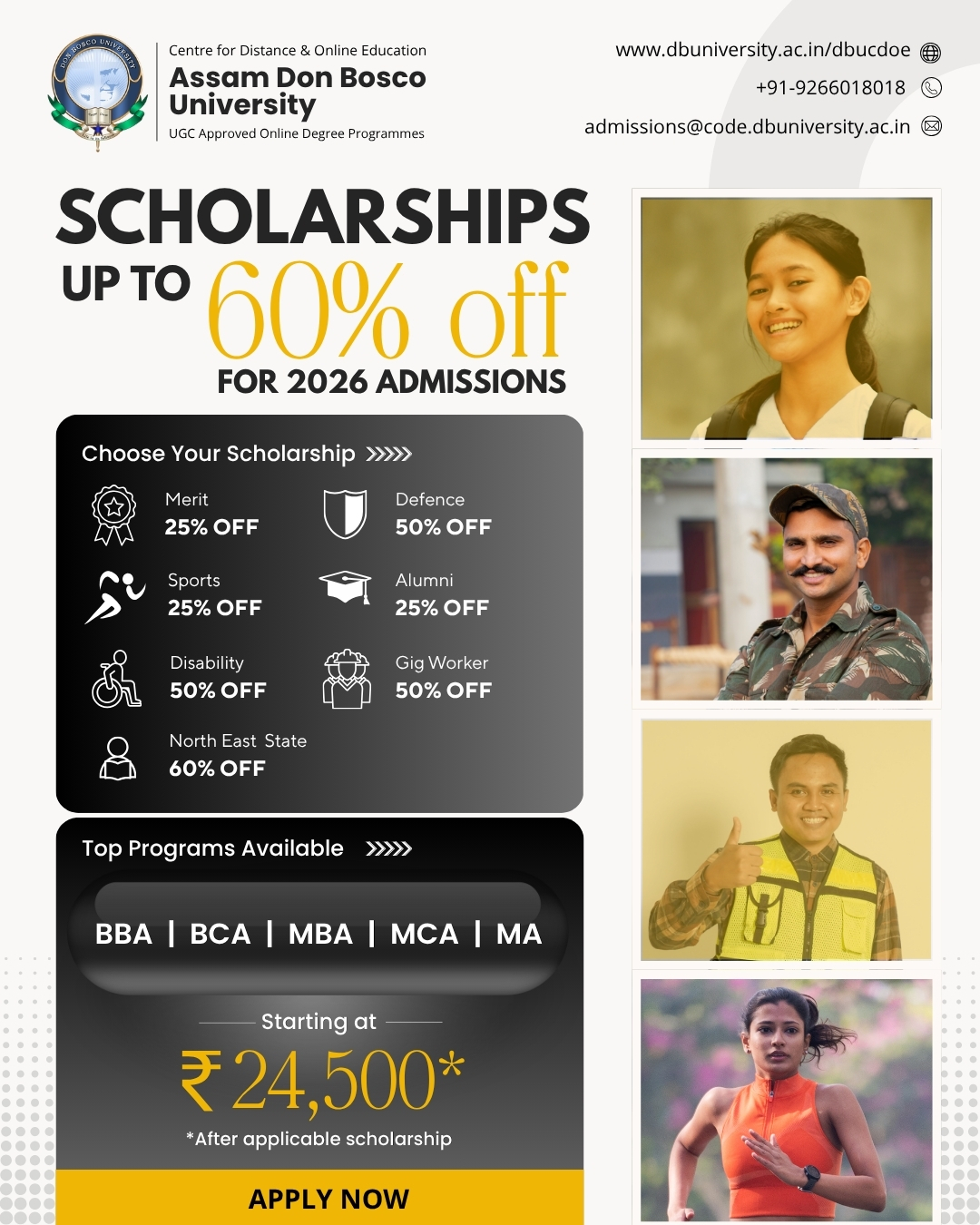 Choosing the right university for an online degree is an important decision, and Assam Don Bosco University stands out as a reliable and student-centric institution. With its wide range of scholarships and flexible fee payment options, DBU ensures that quality education is accessible to everyone.
